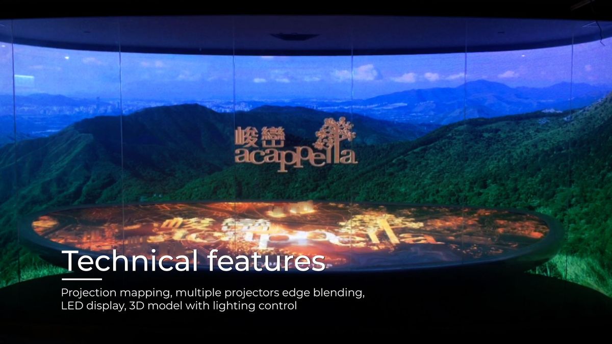 Technical features : Multiple projectors edge blending, LED display, 3D model with lighting control